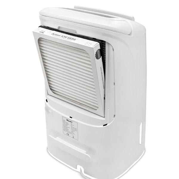 Le déshumidificateur et purificateur d’air AD20G développé par Woods est un appareil domestique efficace idéal pour traiter une pièce de 60 m². Il est équipé d’un hygrostat électronique et digital permettant de fixer le niveau d’humidité souhaité et de régler la vitesse de déshumidification ou de purification. Automatiquement, il fonctionne lorsque c’est nécessaire. Cet appareil possède un réservoir de 4 L et une alarme qui se déclenche lorsque le bac est plein. Il peut fonctionner et déshumidifier en continu (possibilité de connecter un tuyau d’évacuation à l’arrière de l’appareil) pour un meilleur rendement. Grâce à sa fonction « sèche linge », le déshumidificateur AD20G vous permet d’avoir le réglage optimal pour sécher votre linge. Cet appareil est spécialement conçu pour purifier et assainir l’air de votre maison. L’AD20G supprime 99.98% des pollens, poussières, champignons, bactéries et spores de moisissures présentes dans votre intérieur grâce à son filtre Active ION HEPA (Haute Efficacité sur les Particules Aériennes). Il est compact, puissant et très facile à déplacer grâce à sa poignée de transport. Caractéristiques techniques : Surface max: 100 m² – Surface recommandée jusqu’à 60 m² – Nombre de vitesse : Déshumidification 4 / Purification 5 – Volume d’air vitesse : Déshu. 140-235 m3/h / Purif. 55-350 m3/h – Capacité à 30°C & 80% d’humidité : 23 L/24 H – Capacité à 26,7°C & 60% d’humidité : 14 L/24 H – Consommation à 30°C & 80% d’humidité : 290 W – Consommation à 26,7°C & 60% d’humidité : 240 W – Réservoir : 4 L – Niveau sonore : 52 db (A) – Type de gaz réfrigérant : R290 (65 g) – Indice de protection : IPX21.