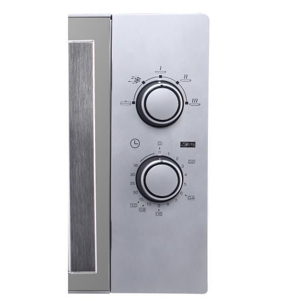 Micro-ondes solo – 5 niveaux de puissance – Commande mécanique – Minuteur 35 min – Plateau tournant Ø 32 cm – Cavité Enamélite : un revêtement particulièrement résistant et facile à nettoyer – Porte finition miroir – Finition silver – Poignée inox.