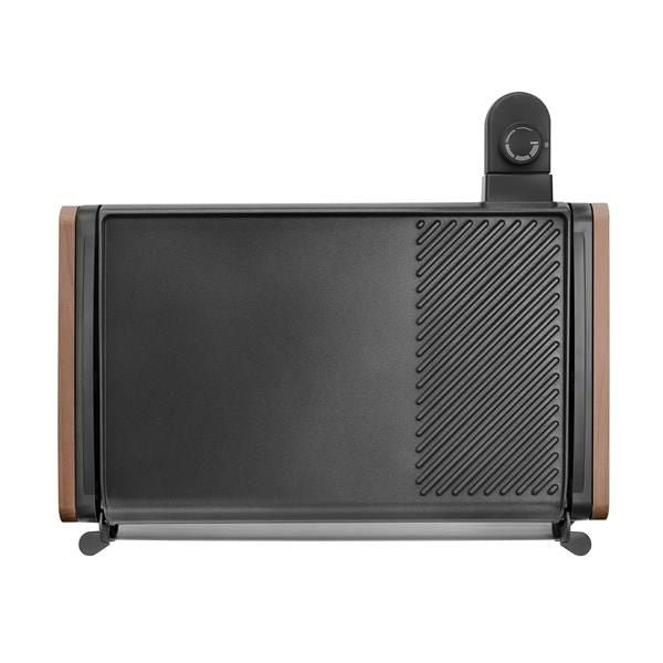 Plancha et grill Equilibre – La cuisson 2 en 1 pour tous les goûts ! – Sa plaque en aluminium anti-adhésive est l’idéale pour une cuisson saine et diététique : Peu de matières grasses sont nécessaires à la cuisson – Astucieux, son bac à jus amovible en inox avec bec verseur vous permet de récupérer les jus de cuisson et facilite l’entretien – Plancha large plaque de cuisson (43 X 28 cm ) dont 29 x 28 cm de plancha et 14 x 28 cm de grill – Résistante moulée dans l’aluminium – Pieds en bakélite et poignées en bois verni – Connecteur alimentation amovible – Coloris noir et bois foncé – Puissance 2000 W – Garantie 2 ans.